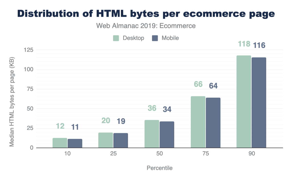Note that HTML payloads may include other code such as inline JSON, JavaScript, or CSS directly in the markup itself, rather than referenced as external links. The median HTML payload size for ecommerce pages is 34 KB on mobile and 36 KB on desktop. However, 10% of ecommerce pages have an HTML payload of more than 115 KB.