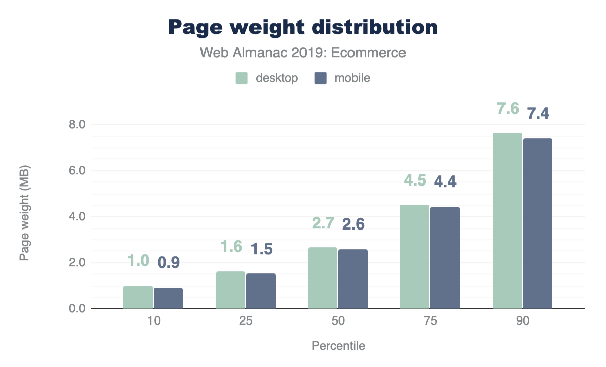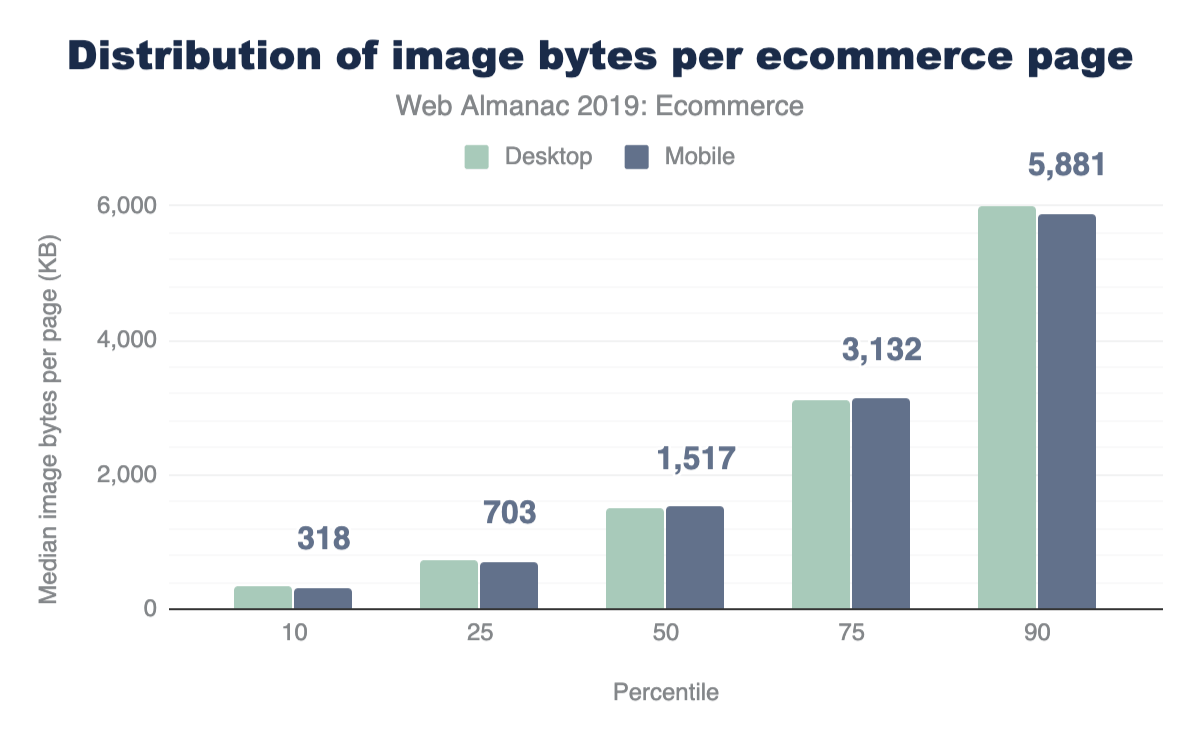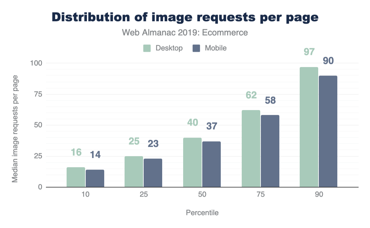 Images constitute the largest number of requests and the highest proportion of bytes for ecommerce pages. The median desktop ecommerce page includes 39 images weighing 1,514 KB (1.5 MB).
