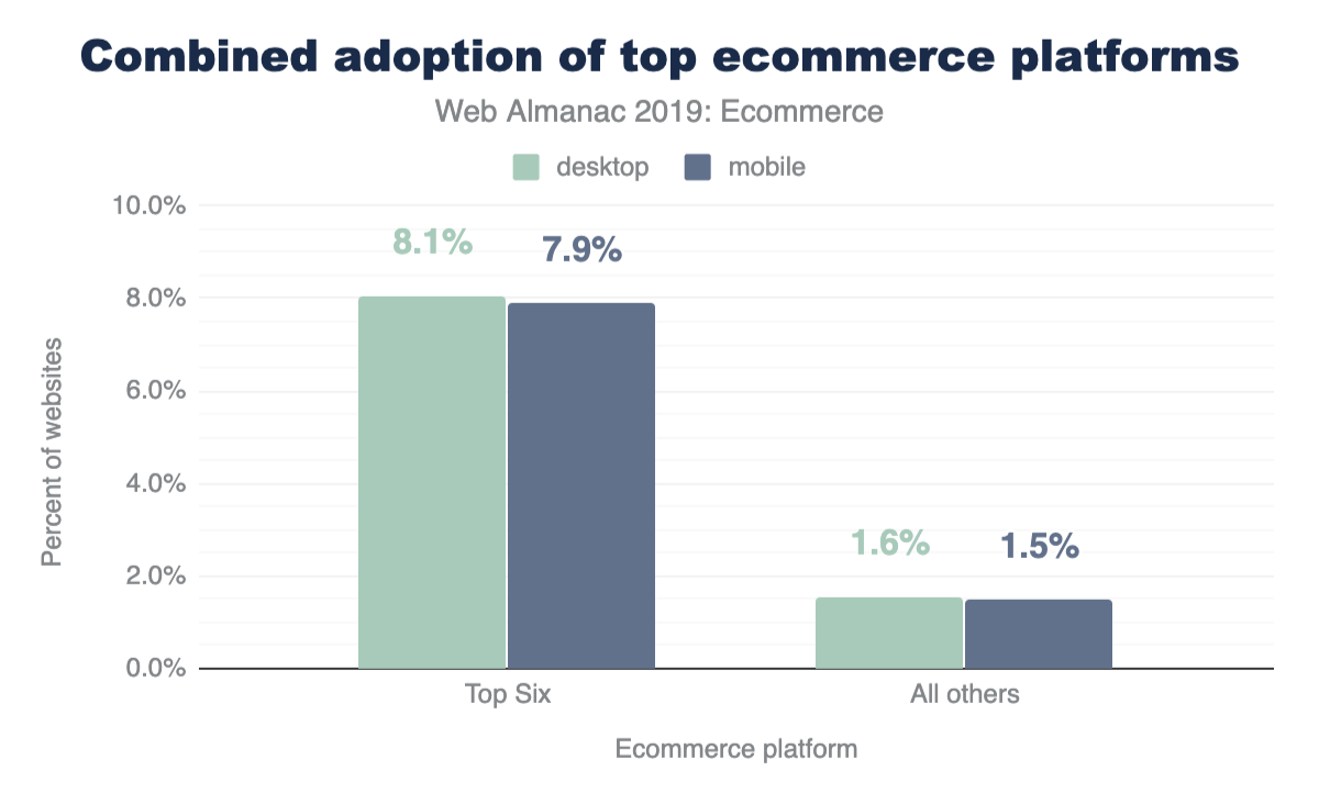 Out of the 116 ecommerce platforms that were detected, only six are found on more than 0.1% of desktop or mobile websites. Note that these results do not show variation by country, by size of site, or other similar metrics.