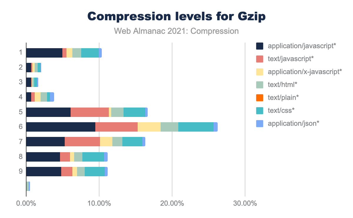 Compared to the other content types, text/plain and text/html use the least amount of compression, with merely 12% and 14% using compression at all. This might be because text/html is more often dynamically generated than static content such as JavaScript and CSS, even though compressing dynamically generated content also has a positive impact. More analysis about the compression of JavaScript content is available in the JavaScript chapter.