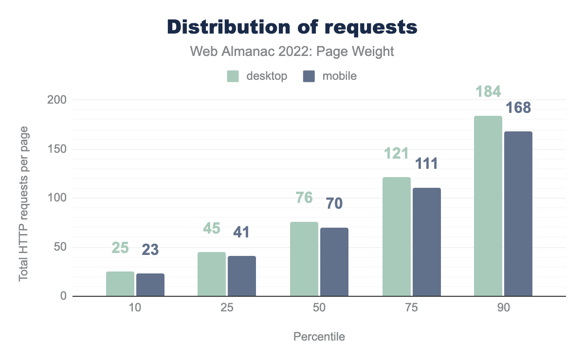 The median page (50th percentile) makes 76 requests for desktop page loads, and 70 on mobile page loads. At all percentiles the difference between desktop and mobile is minimal.