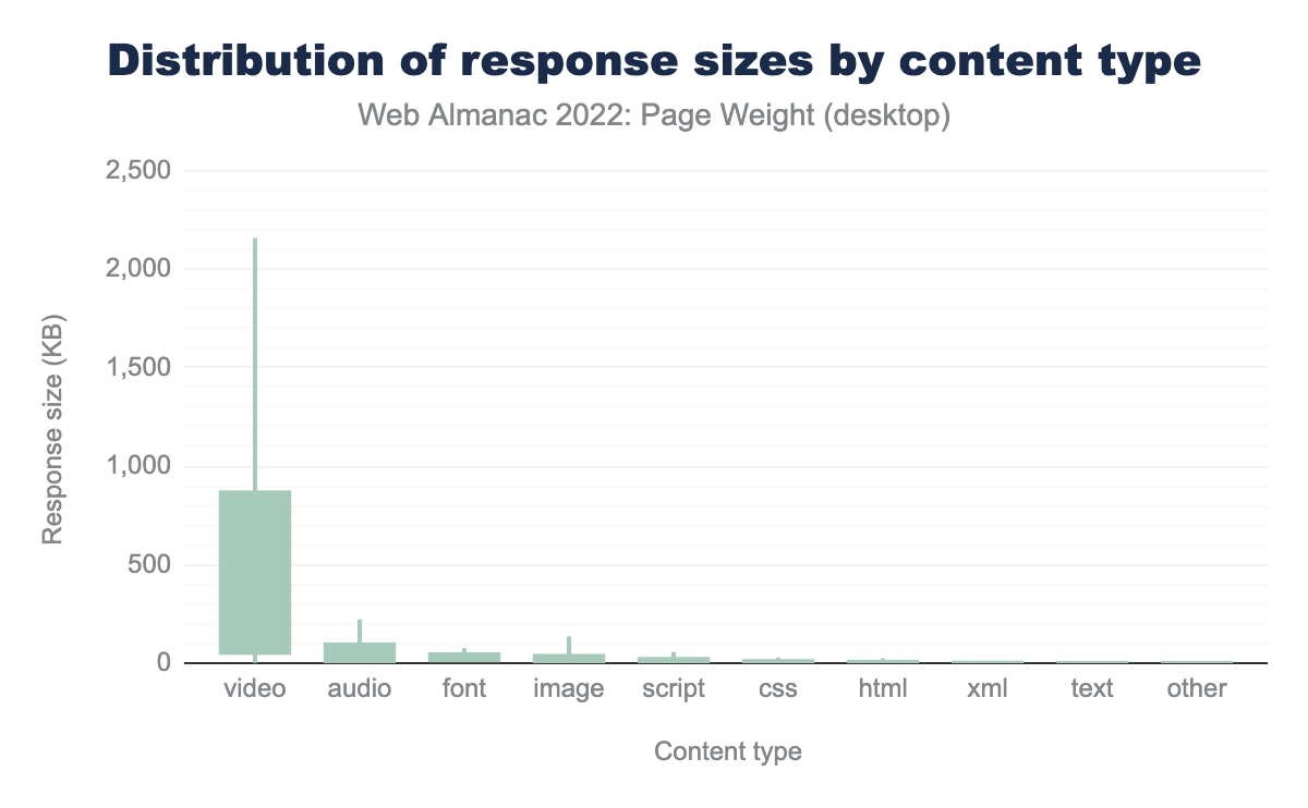 Whilst images are overall the biggest contributors to page weight across the internet, the biggest contributors in sheer size per request are video, audio, and fonts. At the 90th percentile, video requests weigh in at 2,158 KB, four times larger than all the other 90th percentile types combined.