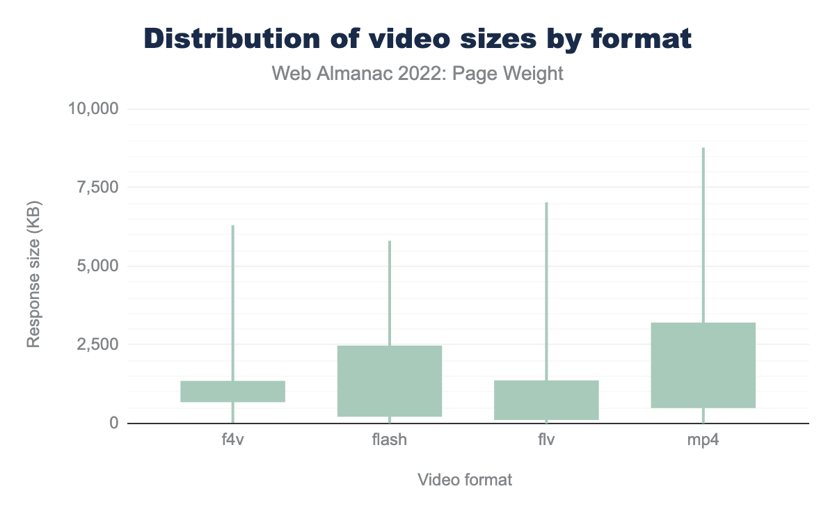 Focusing on file formats, it’s disappointing to see f4v, flash, and flv adding significant weight to pages, the flash player plugin was discontinued in 2021, and removed from major browsers like Chrome, meaning these bytes are most likely entirely wasted.