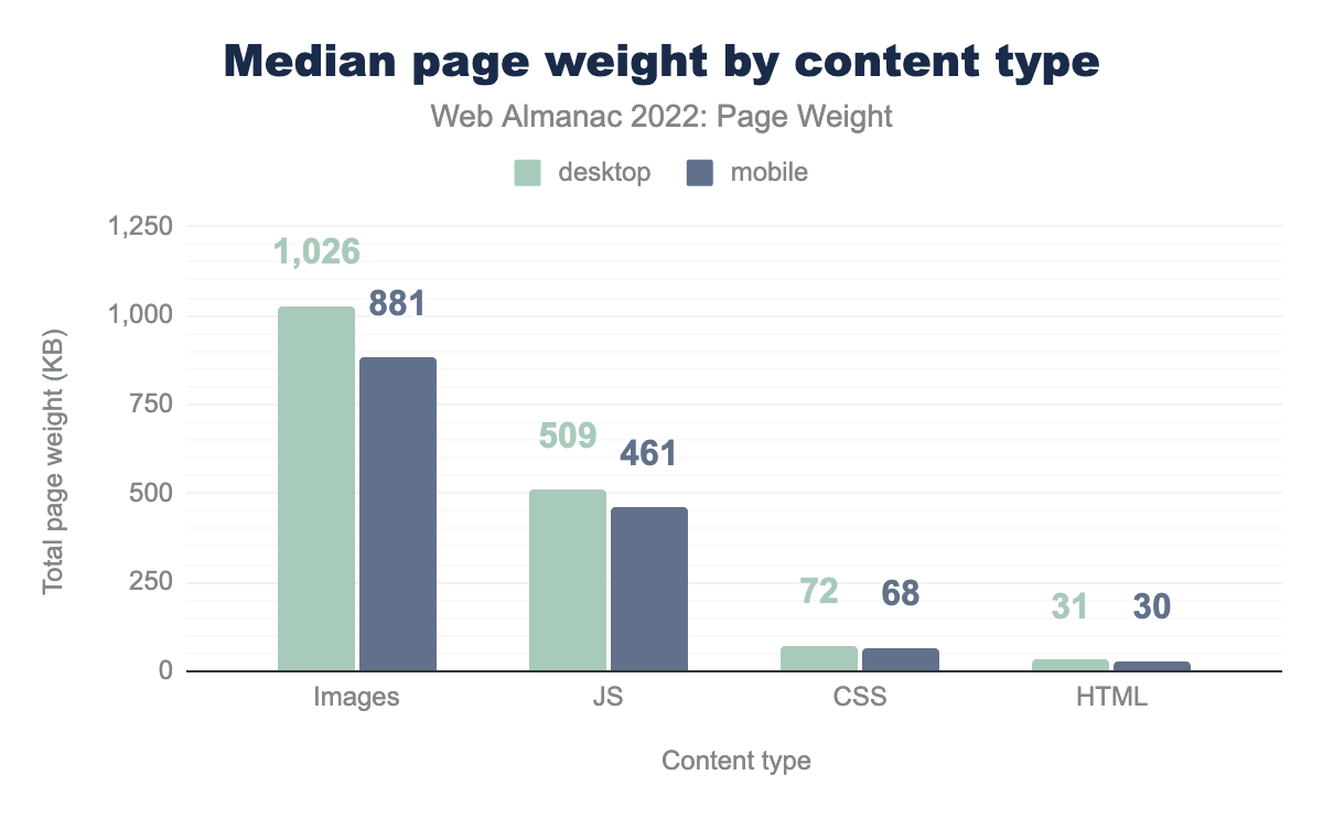 The median desktop image weight for 2022 was 1,026 kilobytes, a mere 44 kilobyte increase from 2021. Mobile barely shifted at 881 kilobytes.