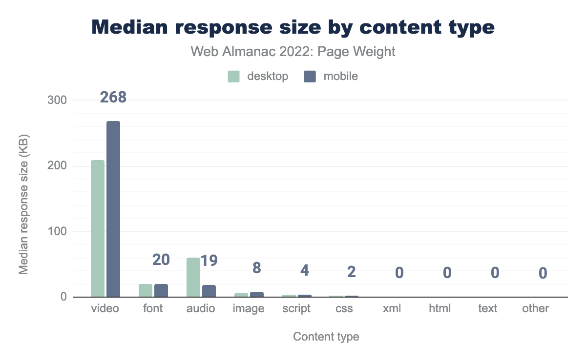 While images and JavaScript remain the largest contributors to byte size, 2022 revealed surprising increases such as a greater prevalence of byte-heavy videos on mobile and the median font byte size being higher than that of its image counterpart.
