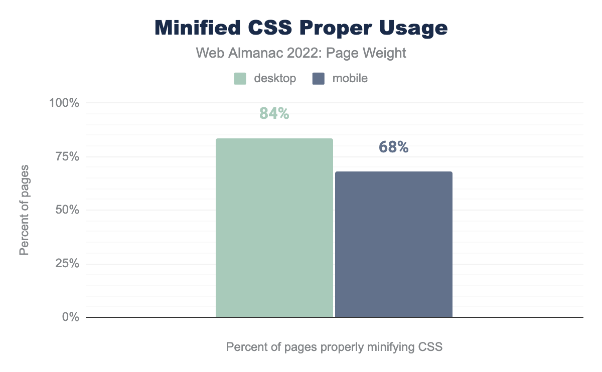 84% of Desktop page loads correctly minified the CSS served, and a smaller 68% of mobile page loads.