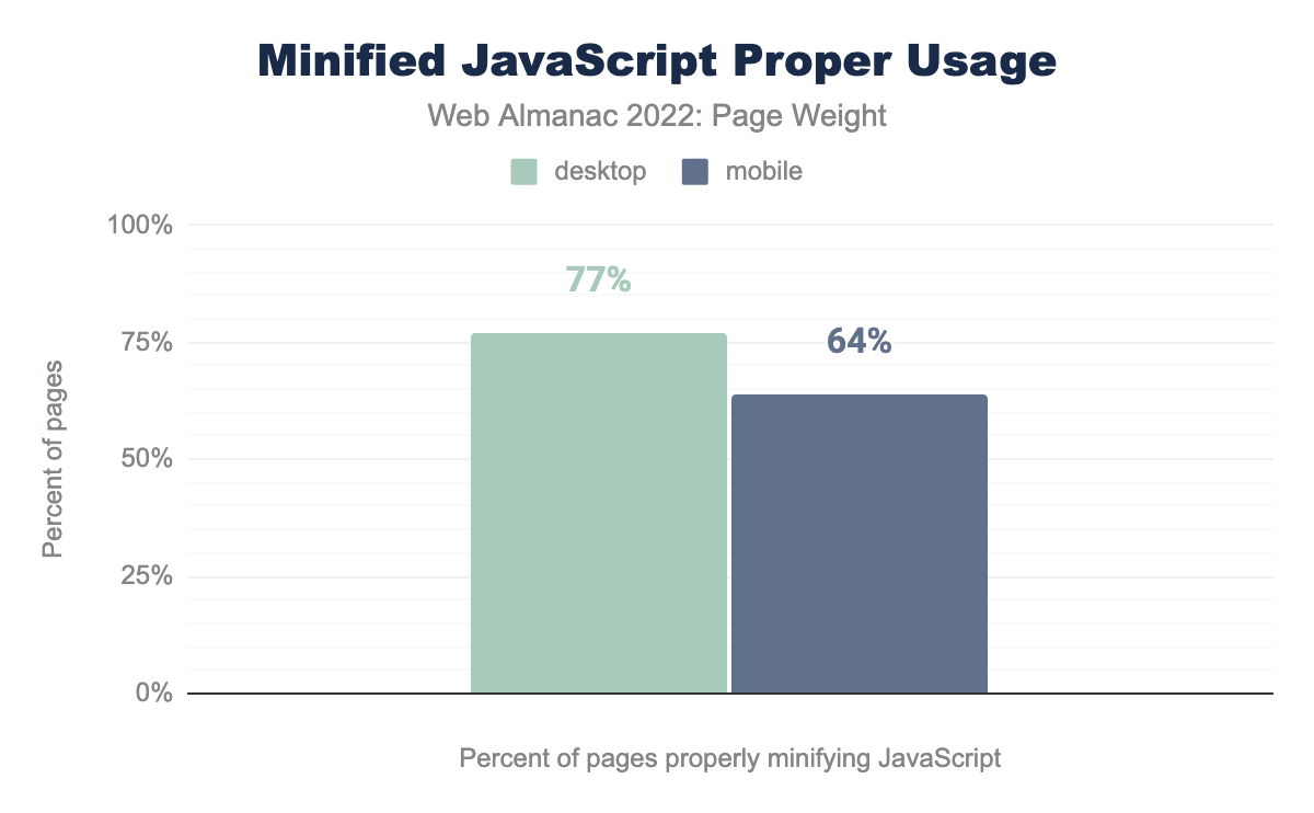 77% of Desktop page loads correctly minified the JavaScript resources served, and a smaller 64% of mobile page loads.