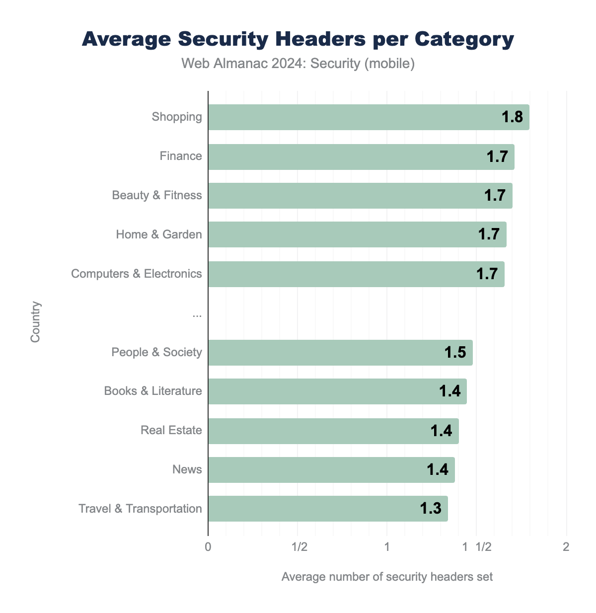 We find that there is a subtle difference in the average number of security headers used depending on the categorization of the website. This number does not directly show the overall security of these sites, but might give an insight into which categories of industry are inclined to implement more security features. We see that shopping and finance lead the list, both industries that deal with sensitive information and high amounts of monetary transactions, which may be reasons to invest in security. At the bottom of the list we see news and travel & transportation. Both are categories in which a lot of sites will host content relating to their respective topics, but may not handle much sensitive data compared to sites in the top categories on the list. In general, this trend seems to be weak.