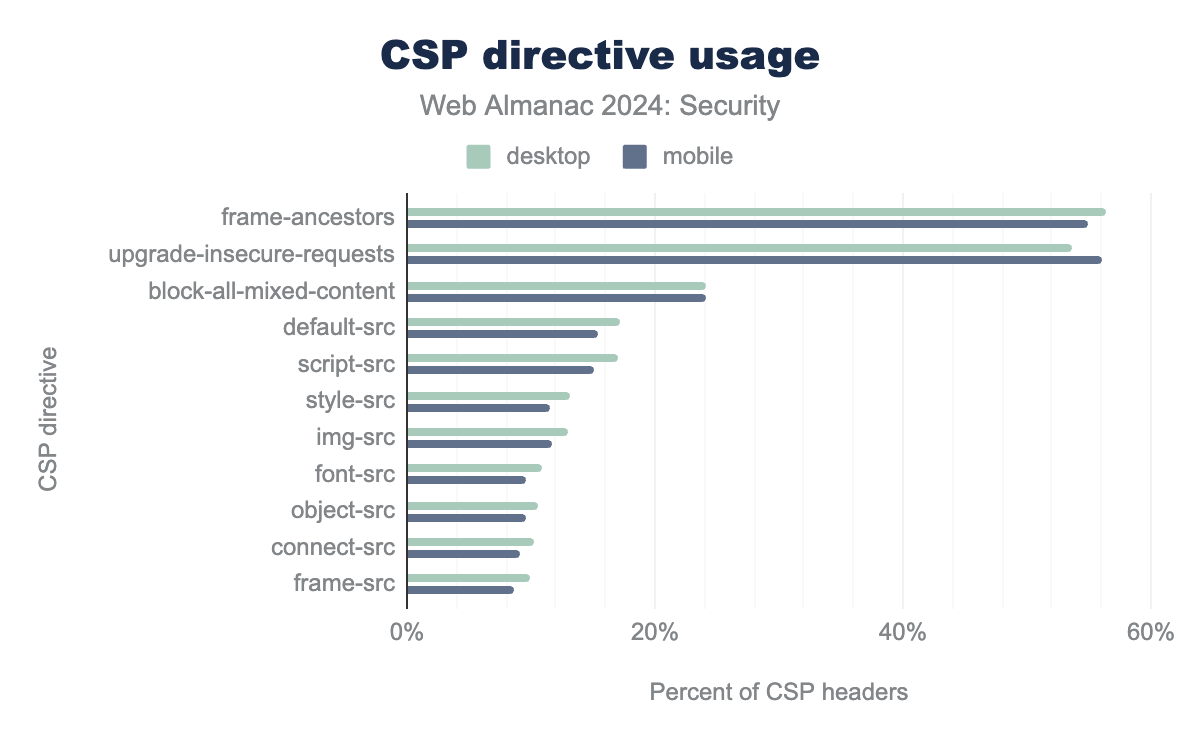 Currently, 30% of responses on mobile have a HSTS header, which is a 5% increase compared to 2022. Users of the header can communicate directives to the browser by adding them to the header value. The max-age directive is obligated. It indicates to the browser the time it should continue to only visit the page over HTTPS in seconds.