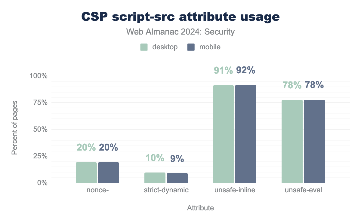Looking back, overall CSP adoption was only at 12% of hosts in 2021, so it’s encouraging to see that growth has remained steady. If this trend continues, projections suggest that CSP adoption will surpass the 20% mark in next year’s Web Almanac.