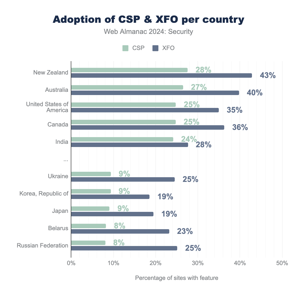 However, attention must also be given to poor configurations or even misconfigurations that can weaken these protections. Issues like invalid directives or poorly defined policies can prevent browsers from enforcing security effectively. For instance, 82.5% of all Timing-Allow-Origin headers allow any origin to access detailed timing information, which could be abused in timing attacks. Similarly, only 1% of websites enable security issue reporting via security.txt, and many still expose their PHP version, an unnecessary risk that can reveal potential vulnerabilities. On the bright side, most of these issues represent low-hanging fruit—addressing them typically requires minimal changes to website implementations.