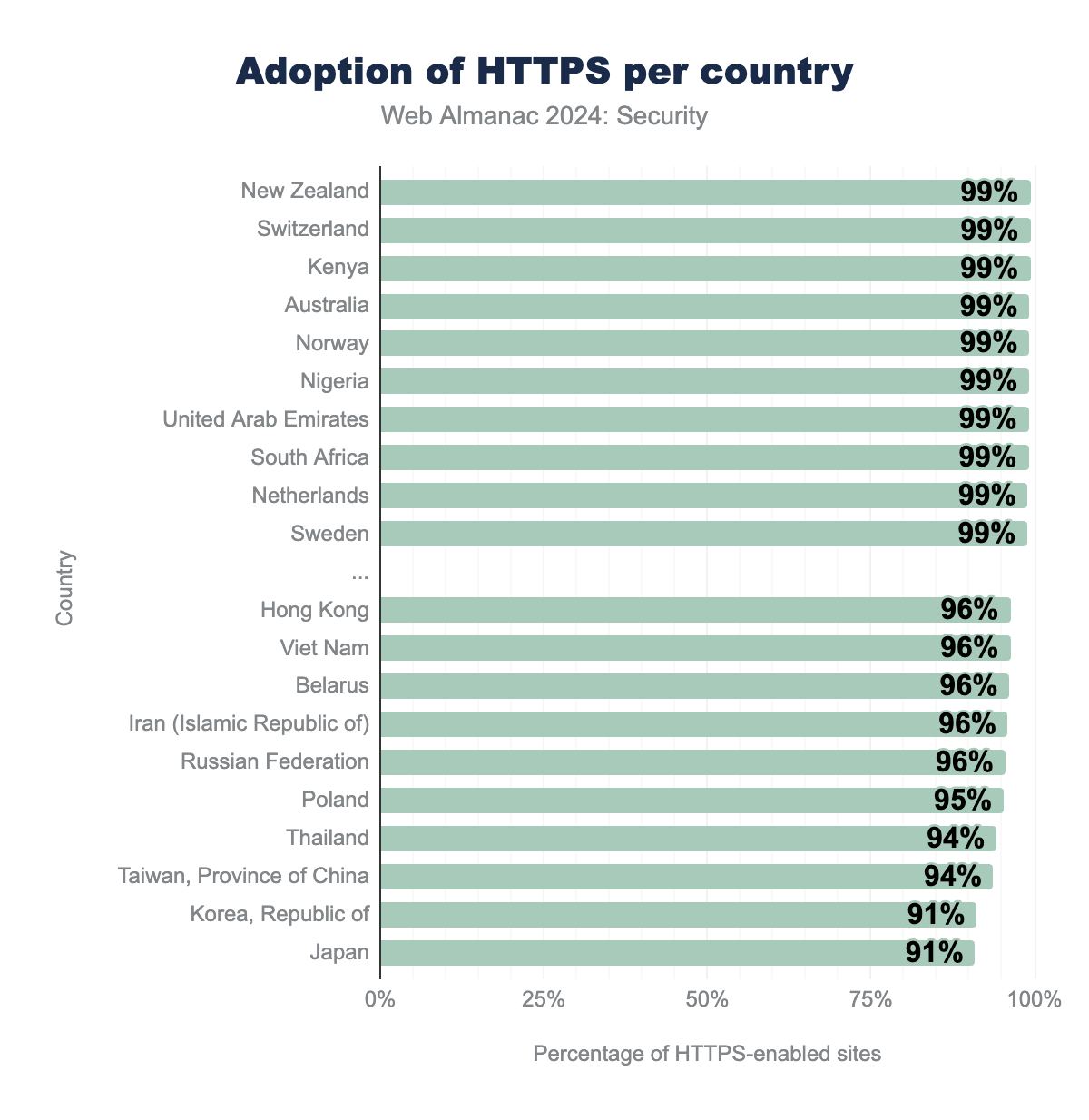 We also investigate the factors driving security practices, analyzing whether elements like country, website category, or technology stack influence the security measures in place. By comparing this year’s findings with those from the 2022 Web Almanac, we highlight key changes and assess long-term trends. This allows us to provide a broader perspective on the evolution of web security practices and the progress made over the years.