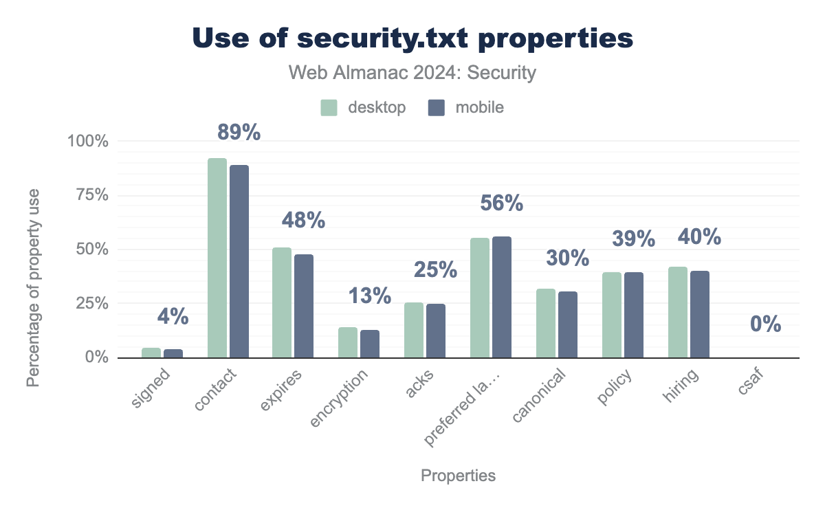 Most of the security.txt files include contact information (88.8%) and a preferred language (56.0%). This year, 47.9% of security.txt files define an expiry, which is a giant jump compared to the 2022 2.3%. This can largely be explained by an update to the methodology, as the analysis only includes text files this year instead of simply all responses with code 200, thereby significantly lowering the false positive rate. It does mean that less than half of the sites that use security.txt are following the standard that (among other requirements) defines the expires property as required. Interestingly, only 39% of the security.txt files define a policy, which is the space developers can indicate what steps a white hat hacker that found a vulnerability should take to report the vulnerability.