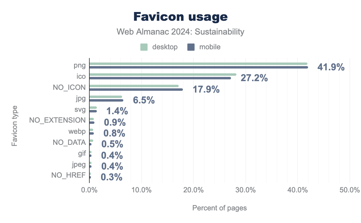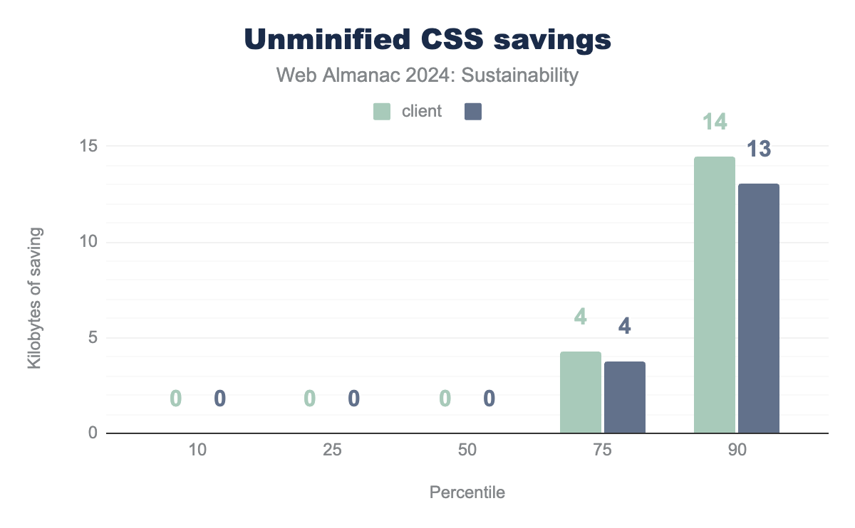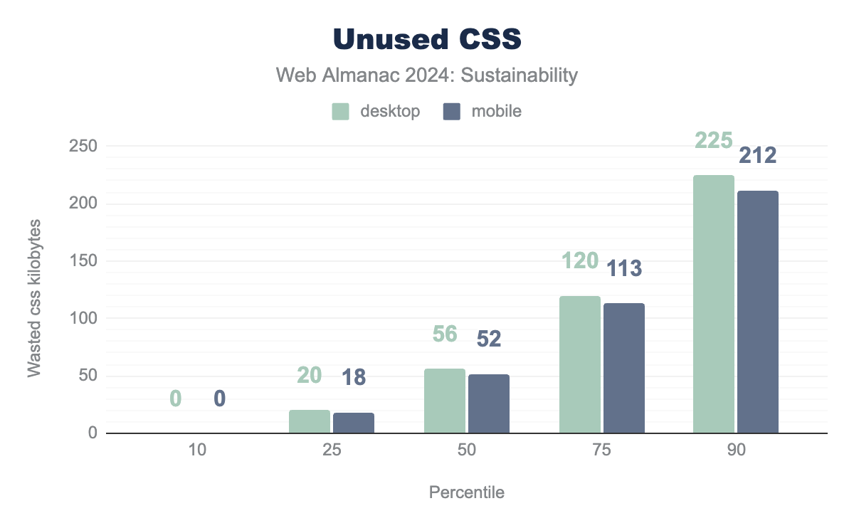Page weight represents the amount of data transferred to access the web page (based only on HTTP requests). It is recommended that this metric be kept as low as possible to ensure a fast load and good user experience for all users. On the 90th percentile, the average mobile site weighs around 7.2 MB, while desktop ones are around 8 MB. The good news is that these numbers are slightly lower than the ones in the 2022 Almanac. The bad news is that these numbers are still way too high. When we talk about sustainability, we usually touch upon inclusion, and to make sure the majority of Internet users can access the page and have a decent user experience, page weight should be kept below 1MB, ideally around 500KB.