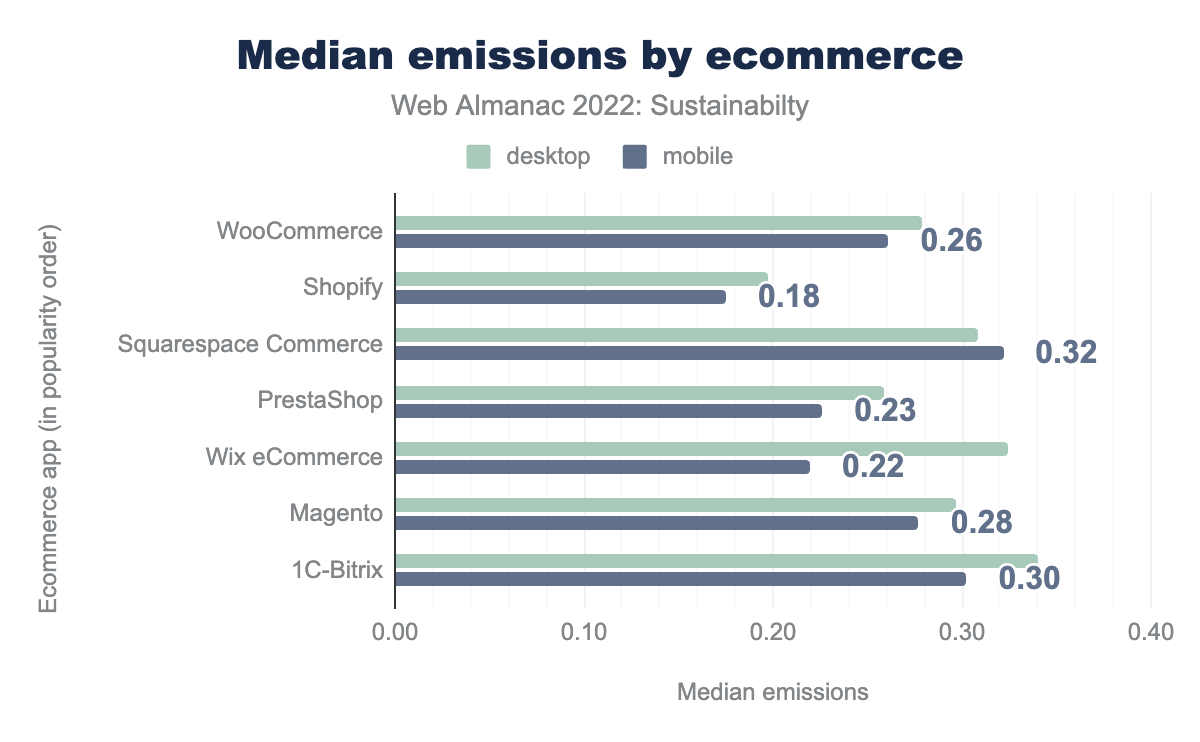 It is clear comparing the ecommerce platforms with other CMS platforms, that they are substantially heavier in their page-load size and their environmental impact. Since these figures mostly relate to home pages, we can only guess that this could be due to more products or less optimized content. However, this shows that there is still room for improvement.