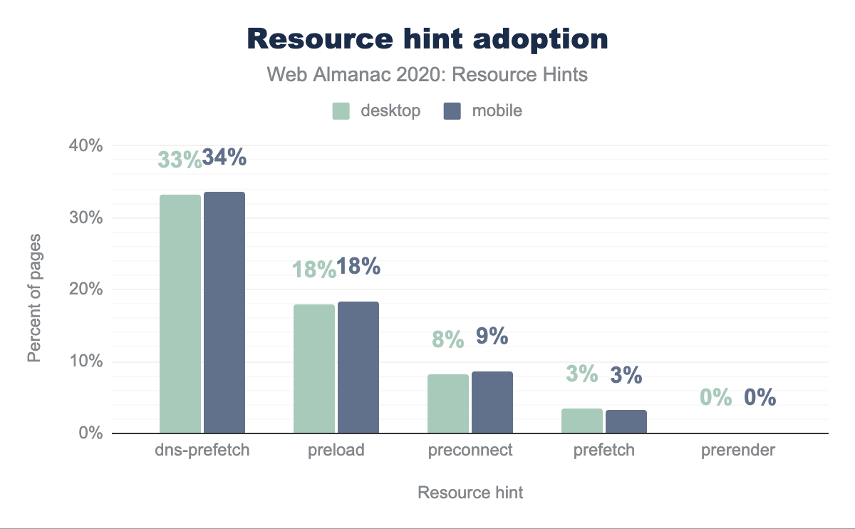 Sempre più pagine web utilizzano le principali resource hints, e nel 2020 stiamo vedendo che l’adozione rimane coerente tra desktop e mobile.