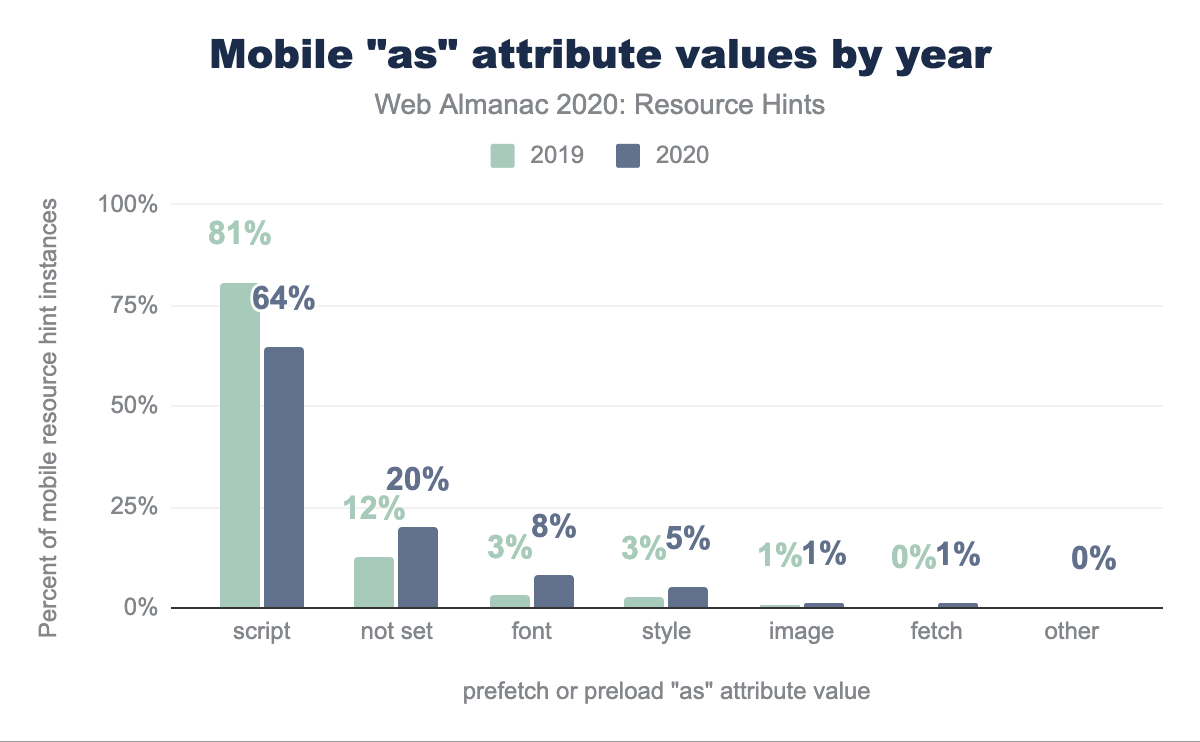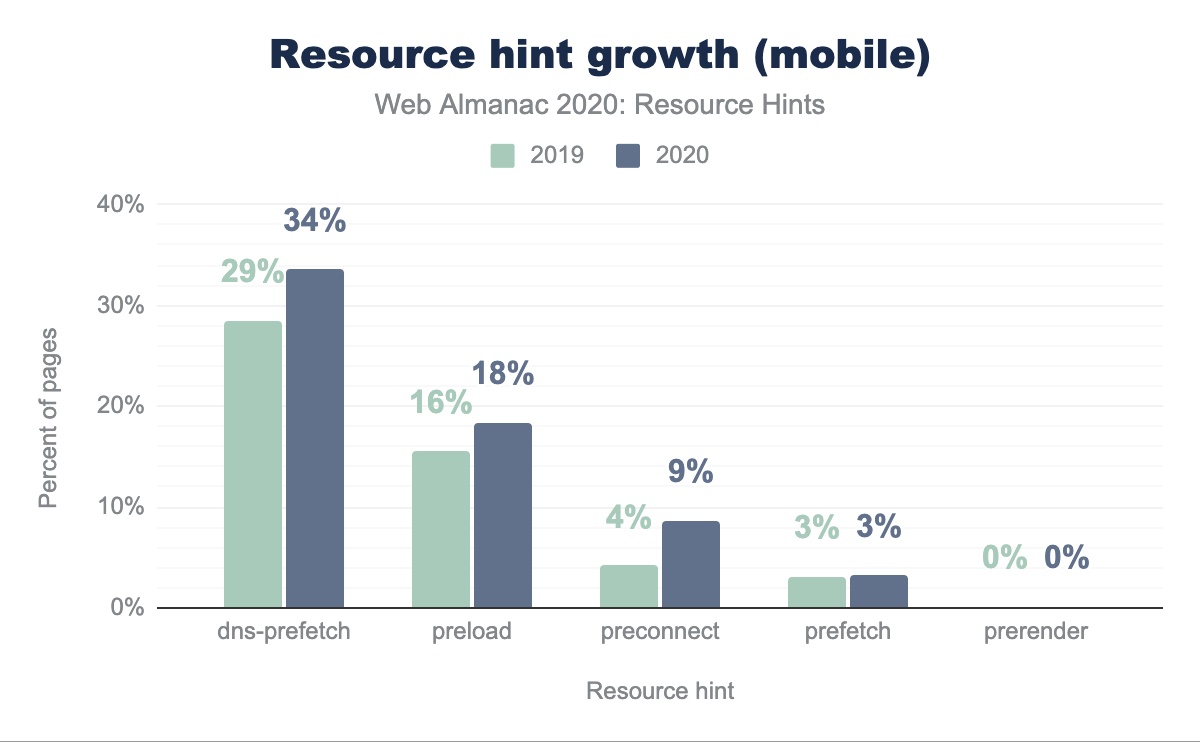 L’utilizzo di preload ha avuto una crescita più lenta con solo un aumento del 2% dal 2019. Ciò potrebbe essere in parte dovuto al fatto che richiede un po’ più di specifiche. Anche se hai solo bisogno del dominio per usare dns-prefetch e preconnect, devi specificare la risorsa per usare preload. Mentre dns-prefetch e preconnect sono ragionevolmente a basso rischio, sebbene possano ancora essere abusati, preload ha un potenziale maggiore di danneggiare effettivamente le prestazioni se usato in modo errato.