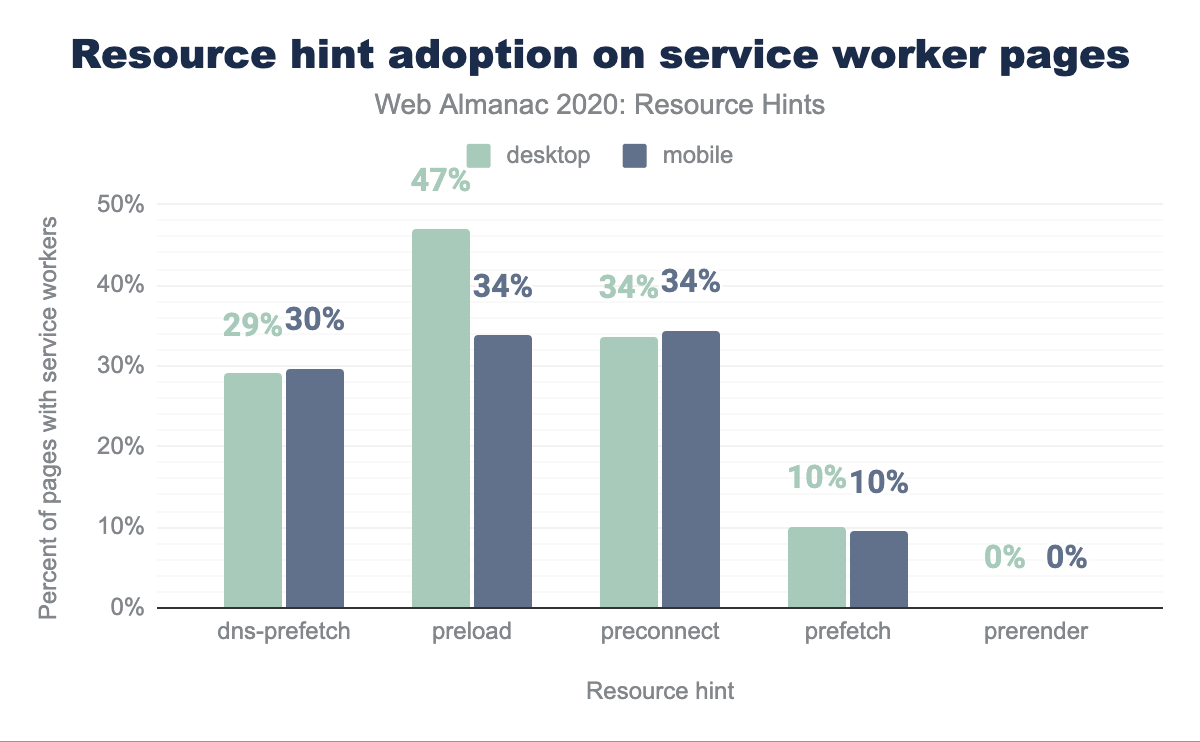 Per preload su desktop abbiamo un eccezionale tasso di adozione del 47% e prefetch un tasso di adozione del 10%. In entrambi i casi i dati sono molto più alti rispetto all’adozione media senza un Service Worker.