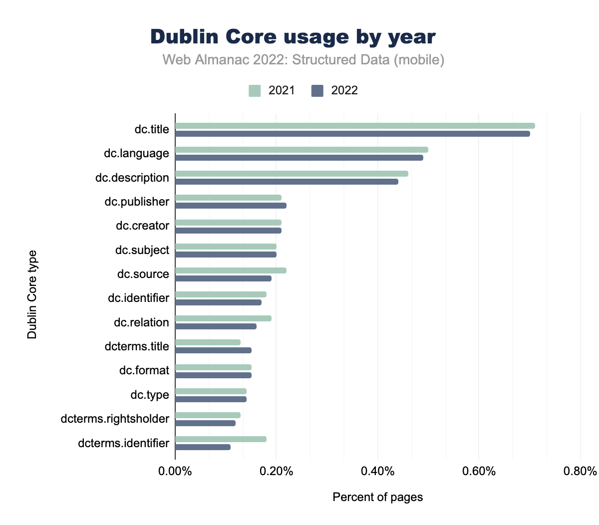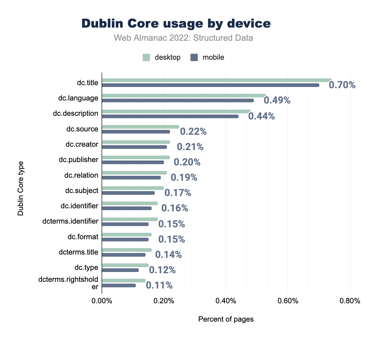 dc.title è stato utilizzato nello 0,74% delle pagine desktop e nello 0,70% delle pagine mobili, dc.language rispettivamente nello 0,53% e 0,49%, dc.description nello 0,48% e 0,44%, dc.publisher nello 0.22% e 0.22%, dc.creator nello 0.22% e 0.21%, dc.subject nello 0.20% e 0.20%, dc.source nello 0.25% e 0.19%, dc.identifier nello 0,18% e 0,17%, dc.relation nello 0,21% e 0,16%, dcterms.title nello 0,16% e 0,15%, dc.format nello 0,16% e 0,15%, dc.type nello 0,15 % e 0,14%, dcterms.rightsholder nello 0,14% e 0,12% e infine dcterms.identifier nello 0,18% delle pagine desktop e nello 0,11% delle pagine mobile.A parte questo, l’utilizzo dei tipi Dublin Core è simile per le pagine mobili e desktop, con lo stesso modesto aumento delle occorrenze rispetto all’anno precedente.