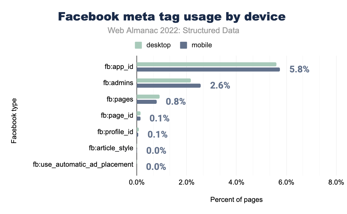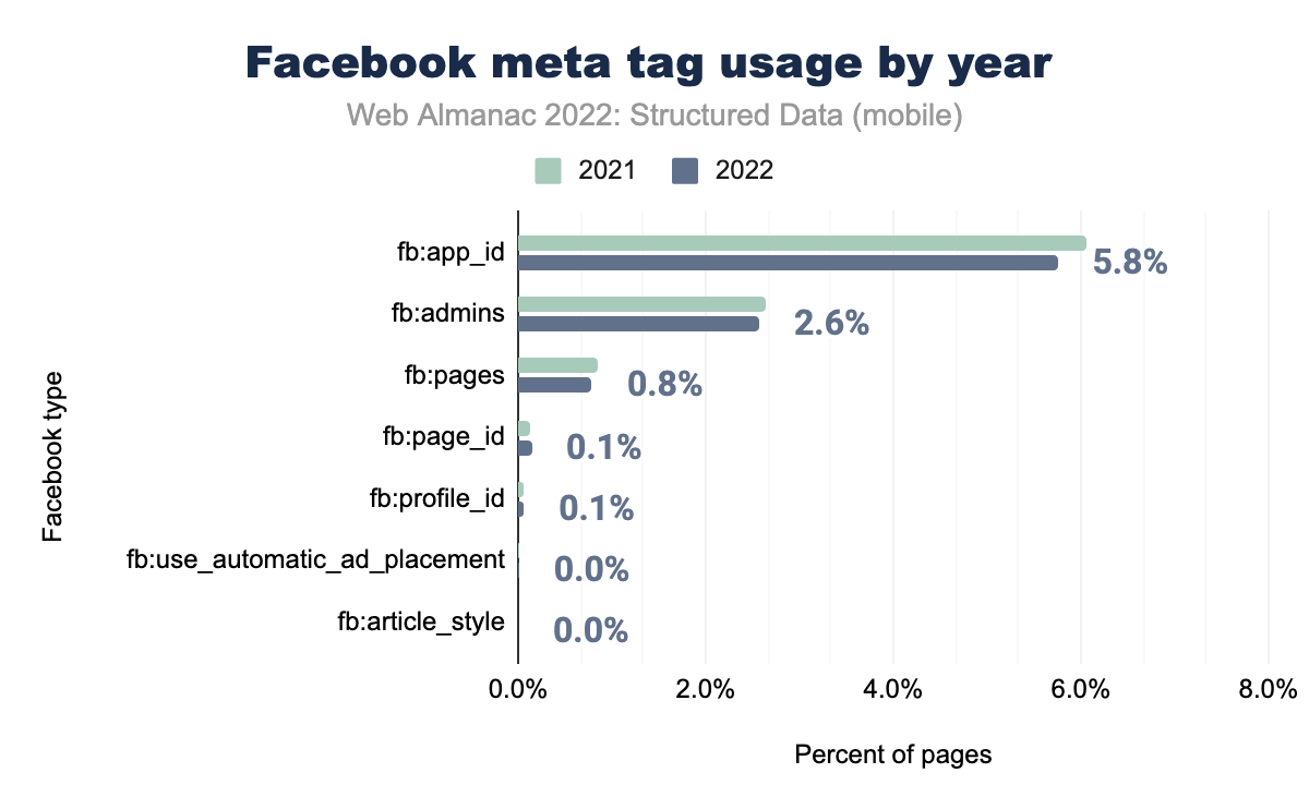 fb:app_id è stato utilizzato nel 6,1% delle pagine mobili nel 2021 e nel 5,8% nel 2022, fb:admins rispettivamente nel 2,6% e nel 2,6%, fb:pages nello 0,9% e nello 0,8%, fb:page_id e fb:profile_id nello 0,1% in entrambi gli anni e fb:use_automatic_ad_placement e fb:article_style nello 0,0% in entrambi gli anni.Di tutti i tag di Facebook qui, ce ne sono solo tre con un numero significativo di apparizioni. Si tratta degli stessi tre che erano primi nel 2021, vale a dire fb:app_id, fb:admins e fb:pages al 5,8%, 2,6% e 0,8% nei dispositivi mobili, tutti in leggera diminuzione rispetto allo scorso anno.