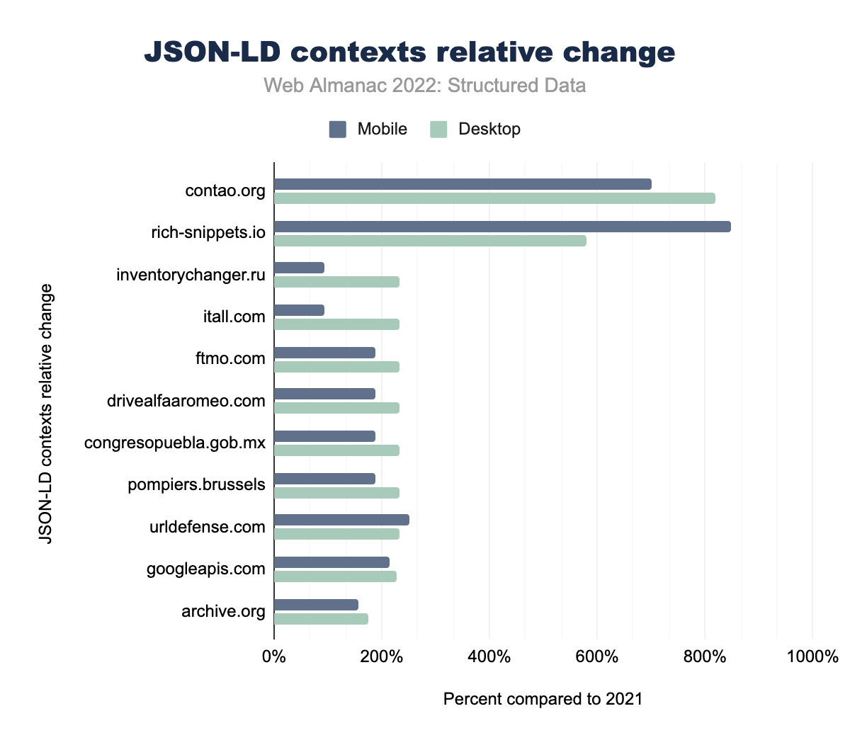 contao.org ha avuto un aumento dell’819% su desktop e del 701% su mobile, per contao.org è stato rispettivamente dell’819% e del 701%, per rich-snippets.io del 579% e 849%, per inventorychanger.ru 232% e 94%, per itall.com 232% e 94%, per ftmo.com 232% e 189%, per drivealfaaromeo.com 232% e 189% , per congresopuebla.gob.mx 232% e 189%, per pompiers.brussels 232% e 189%, per urldefense.com 232% e 252%, per googleapis.com 227% e 214%, e infine per archive.org c’è stato un aumento del 174% su desktop e del 157% su mobile.Per i contesti JSON-LD, schema.org è di gran lunga il maggior contributore, con oltre 6.000 volte il numero di occorrenze in pagine desktop e oltre 3.500 volte il numero di occorenze in pagine mobili rispetto al secondo contributore, googleapis.com. Detto questo, le occorrenze di googleapis.com sono più che raddoppiate sia per le pagine desktop che per quelle mobili, a differenza del modesto aumento di schema.org al 108% dei valori dello scorso anno. In termini di maggior crescita, contao.org e rich-snippets.io occupano i primi posti con l’aumento dell’819% nelle pagine desktop di contao.org e l’aumento dell’849% nelle pagine mobili di rich-snippets.io. Contao.org è al 4° posto nel totale delle voci, mentre rich-snippets.io è all’8° posto.