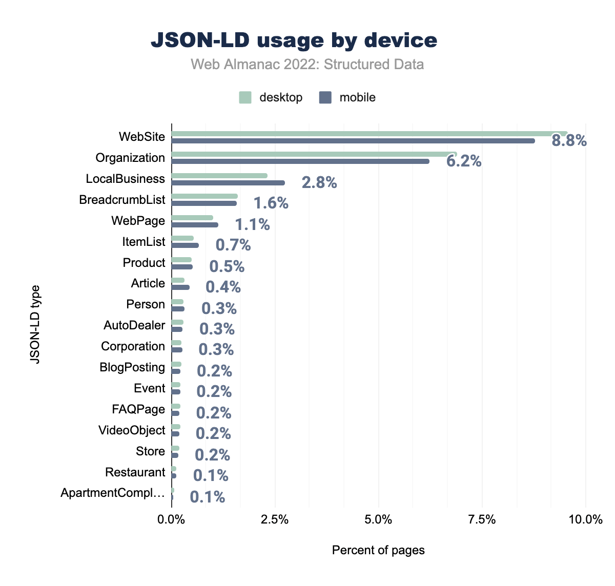 WebSite è stato utilizzato nell’8,9% delle pagine mobili nel 2021 e nell’8,8% nel 2022, Organization rispettivamente nel 6,0% e nel 6,2%, LocalBusiness nell’1,7% e nel 2,8%, BreadcrumbList nell’1,5% e 1,6%, WebPage nel 1,0% e 1,1%, Product nel 0,6% e 0,7%, ItemList nel 0,5% e 0,5%, BlogPosting nel 0,5% e 0,4%, Article nel 0,3% e 0,3%, Restaurant nello 0,2% e 0,3%, Person nello 0,3% e 0,3%, AutoDealer nello 0,2% e 0,2%, FAQPage nello 0,1% e 0,2%, Corporation nello 0,2% e 0,2%, Event nello 0,2% e 0,2%, Store nello 0,2% e 0,2%, VideoObject nello 0,2% e 0,1% e infine ApartmentComplex nello 0,1% nelle pagine mobili sia nel 2021 che nel 2022.I tipi JSON-LD continuano ad essere per lo più simili all’anno precedente con però alcuni notevoli incrementi. Vale a dire, questi sono LocalBusiness(che è aumentato raggiungendo il 2,8% delle pagine nel nostro set) e Restaurant (che è aumentato a quota 0,3% delle pagine nel nostro set).