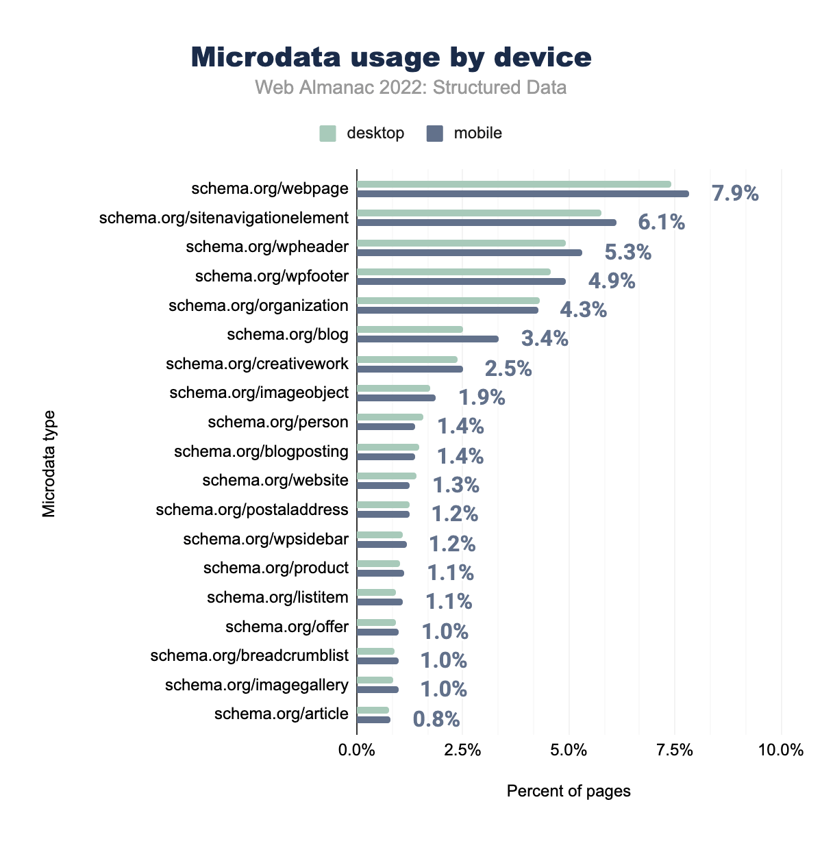 schema.org/webpage è stato utilizzato nel 7,4% delle pagine per dispositivi mobili nel 2021 e nel 7,9% nel 2022, schema.org/sitenavigationelement rispettivamente nel 5,6% e nel 6,1%, schema.org/wpheader nel 4,9 % e 5,3%, schema.org/wpfooter nel 4,6% e 4,9%, schema.org/organization nel 4,0% e 4,3%, schema.org/blog nel 3,7% e 3,4%, schema.org/creativework nel 2,1% e nel 2,5%, schema.org/imageobject nel’1,8% e nel’1,9%, schema.org/person nel’1,4% e nell’1,4%, schema.org/website nel’1,3% e 1,4%, schema.org/postaladdress nel 1,3% e 1,3%, schema.org/blogposting nel 1,3% e 1,2%, schema.org/wpsidebar nel 1,4% e 1,2%, schema.org/imagegallery nel 1,1% e 1,1%, schema.org/product nel 1,2% e 1,1%, schema.org/offer nel 1,1% e 1,0%, schema.org/listitem nel 1,0% e 1,0% , schema.org/breadcrumblist nell’1,0% e nell’1,0% e infine schema.org/article nello 0,9% delle pagine per dispositivi mobili nel 2021 e nello 0,8% delle pagine per dispositivi mobili nel 2022.La maggior parte delle proprietà per i Microdata non ha subito grandi cambiamenti, con un leggero aumento di alcune delle proprietà più comuni come webpage, sitenavigationelement e wpheader che appaiono rispettivamente nel 7,9%, 6,1% e 5,3% delle pagine per dispositivi mobili .