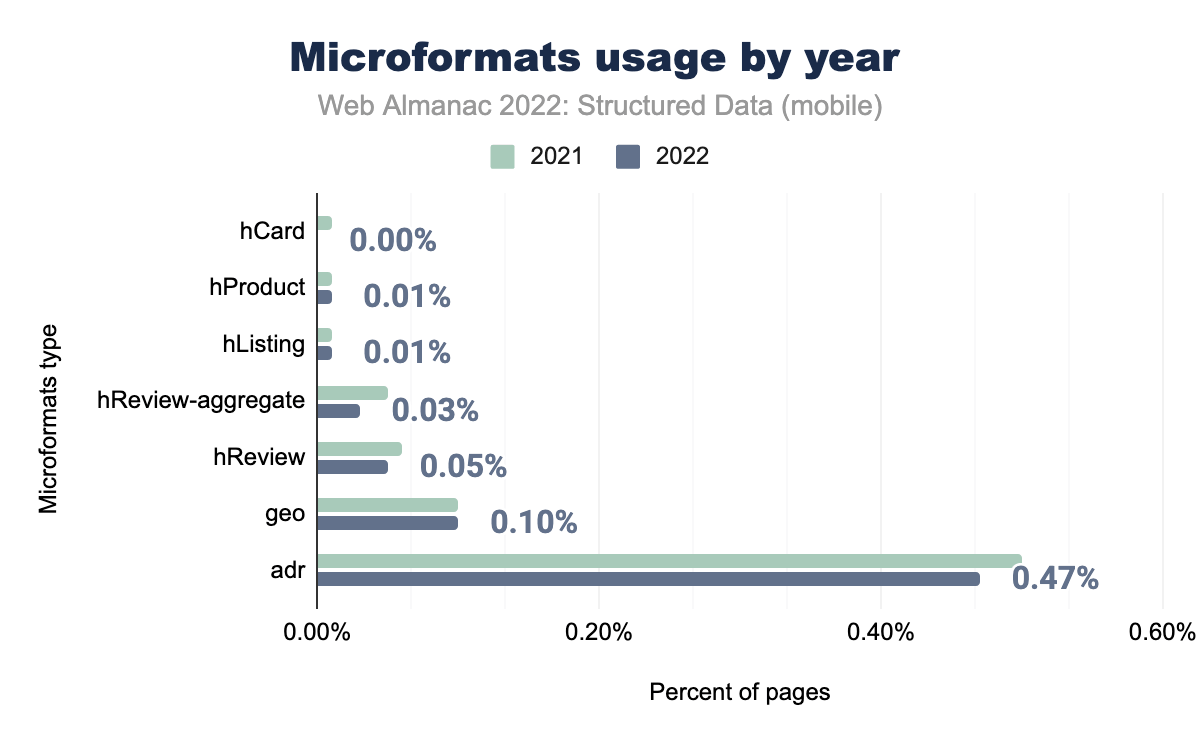 adr è stato utilizzato nello 0,50% delle pagine mobili nel 2021 e nello 0,47% nel 2022, geo rispettivamente nello 0,10% e 0,10%, hReview nello 0,06% e 0,05%, hReview-aggregate nello 0,05 % e 0,03%, hListing e hProduct nello 0,01% in entrambi gli anni, e infine hCard nello 0,01% delle pagine mobile nel 2021 e nello 0,00% nel 2022.I Microformat (microformati) sono rimasti molto simili nei dati di utilizzo dal 2021, con adr (presente nello 0,47% delle pagine del nostro set) che è ancora il più comune nella classifica.