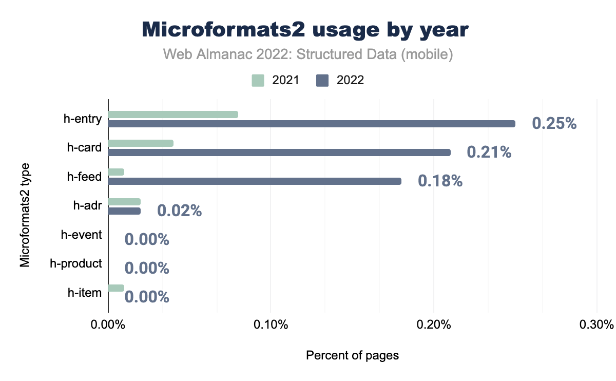 h-entry è stato utilizzato nello 0,08% delle pagine mobili nel 2021 e nello 0,25% nel 2022 h-card rispettivamente nello 0,04% e 0,21%, h-feed nello 0,01% e 0,18% , h-adr nello 0,02% e 0,02%, h-event nello 0,00% e 0,00%, h-product nello 0,00% e 0,00% e infine h-item è stato utilizzato nello 0,01% delle pagine mobili nel 2021 e 0,00% nel 2022.Nel frattempo, gli attributi nel formato Microformat2 sono saliti alle stelle dal 2021. Le proprietà h-entry, h-card e h-feed hanno visto copicui aumenti nel nostro set di pagine, il che spiega il fatto che gli attributi Microformat2 sono complessivamente quasi triplicati nel nostro set dall’anno precedente.