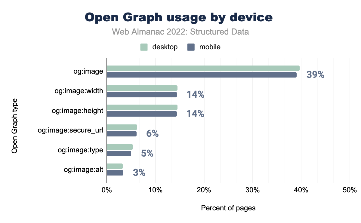 og:image è stato utilizzato nel 40% delle pagine desktop e nel 39% delle pagine mobili, og:image:width rispettivamente nel 15% e nel 14%, og:image:height nel 15% e 14%, og:image:secure_url nel 6% e 6%, og:image:type nel 5% di entrambi, e infine og:image:alt è stato utilizzato nel 3% sia su desktop che su dispositivi mobili.Abbiamo visto un aumento nell’utilizzo di ciascun tipo di Open Graph presente nella top 10 dei tipi, sia su dispositivi mobili che su desktop, il che ha portato ad una crescita complessiva di Open Graph dell’1,5% rispetto al 2021.