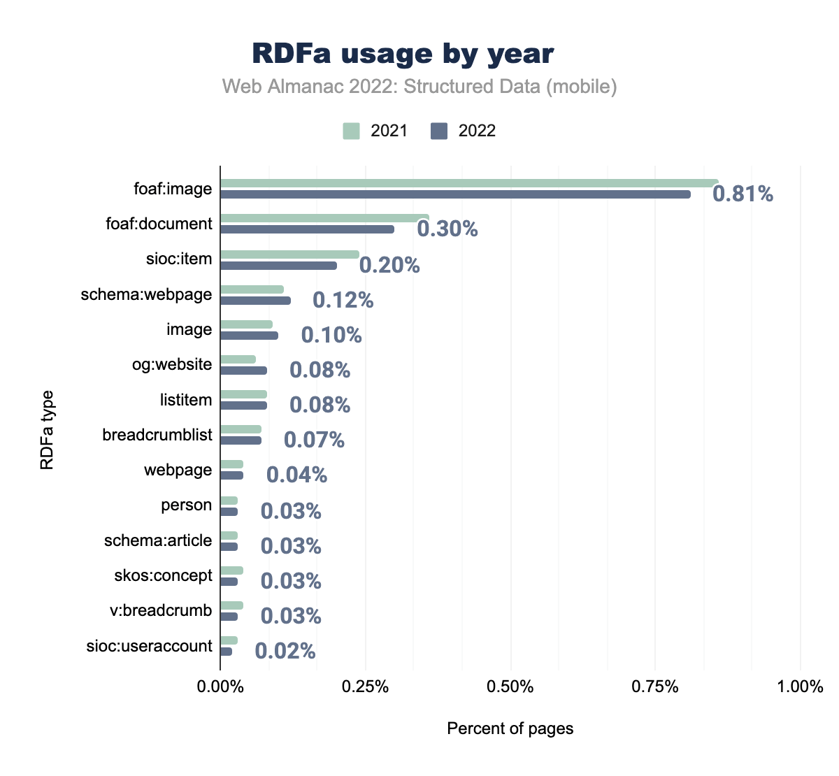 foaf:image è stato utilizzato rispettivamente nello 0,86% delle pagine nel 2021 e nello 0,81% nel 2022, foaf:document nello 0,36% e 0,30%, sioc:item nello 0,24% e 0,20 %, schema:webpage nello 0,11% e 0,12%, image nello 0,09% e 0,10%, og:website nell 0,06% e 0,08%, listitem nello 0,08% e 0,08%, breadcrumblist nello 0,07% e 0,07%, webpage nello 0,04% e 0,04%, person nello 0,03% e 0,03%, schema:article nello 0,03% e 0,03%, skos:concept nello 0,04% e 0,03%, v:breadcrumb nello 0,04% e nello 0,03% e infine sioc:useraccount è stato utilizzato nello 0,03% delle pagine nel 2021 e nello 0,02% nel 2022.Quando si valutano i tipi di RDFa, foaf:image rimane presente su un maggior numero di pagine rispetto a qualsiasi altro tipo, sebbene abbia mostrato una diminuzione della percentuale di pagine nel nostro set dal 2021. Questo vale anche per i due tipi successivi, foaf:document e sioc:item, con piccole diminuzioni nell’utilizzo. Molti degli altri tipi mostrano un leggero aumento nell’utilizzo, come è successo agli RDFa nel complesso.