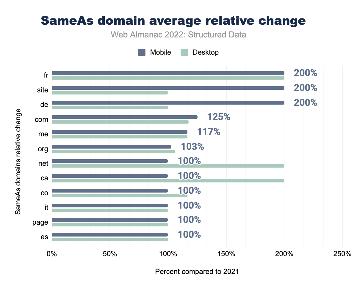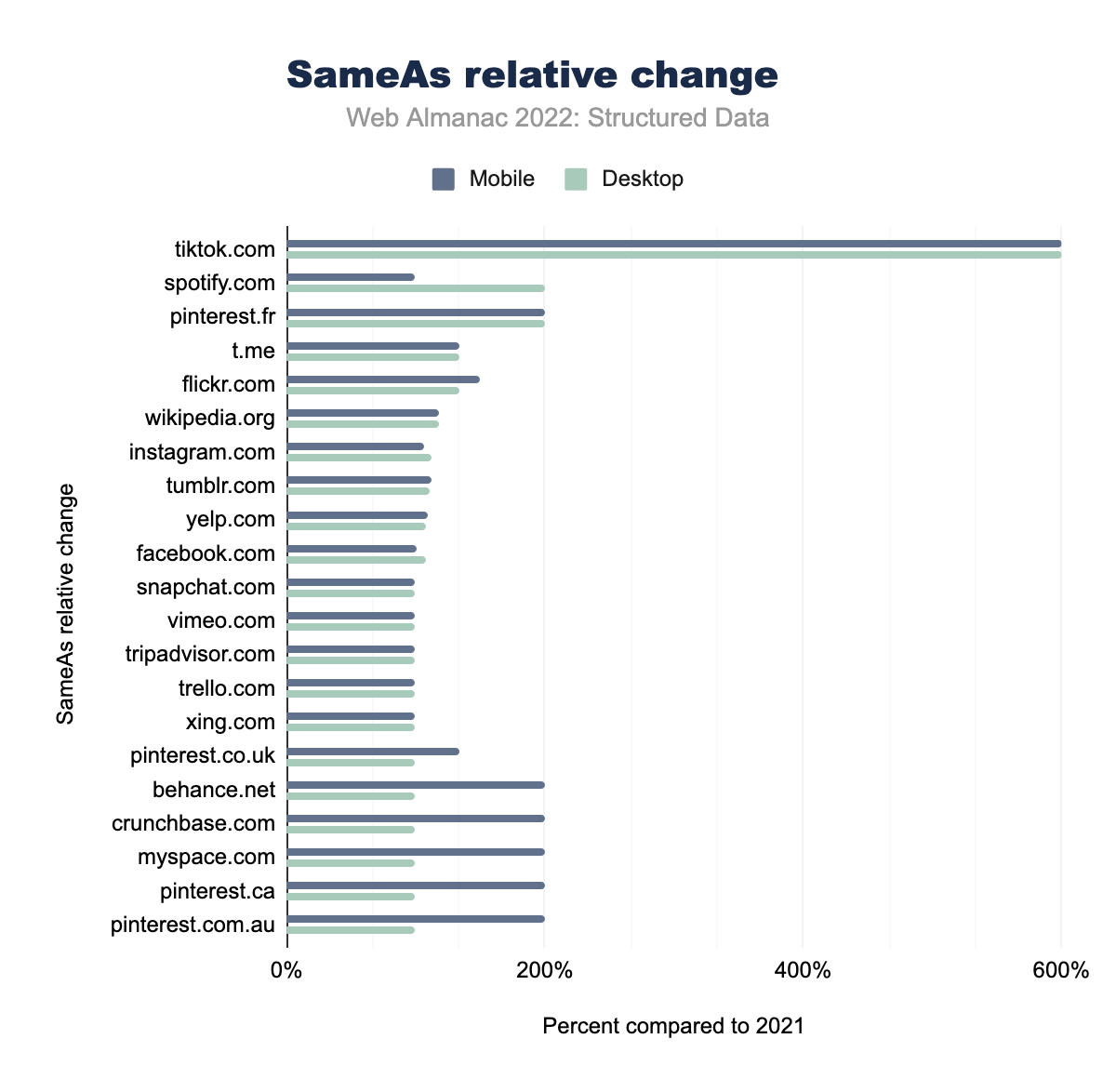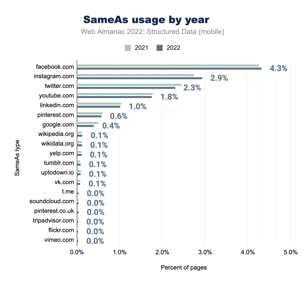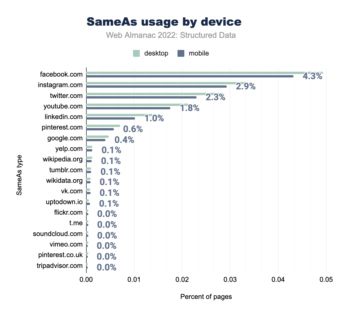 Come nel 2021, i valori più comuni della proprietà sameAs sono le piattaforme di social media. Queste includono facebook.com (al 4,32% su mobile e 4,94% su desktop), instagram.com (al 2,93% su mobile e 3,34% su desktop) e twitter.com (al 2,30% su mobile e 2,86% su desktop). I primi due fra questi hanno visto un leggero aumento sui dispositivi mobili dal 2021, e tutti e 3 in aumento sul desktop.