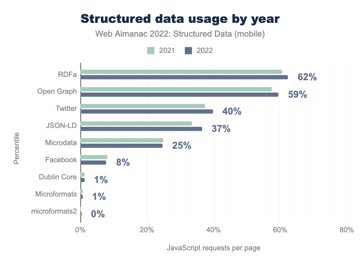 Questo è il secondo anno in cui il Web Almanac include un capitolo sui dati strutturati. Il contenuto dell’anno scorso ha fornito una solida base sul concetto di dati strutturati, tratteggiando il motivo per cui esiste, i tipi di dati strutturati utilizzati più di frequente e i vantaggi per le organizzazioni. Quest’anno abbiamo confrontato i dati raccolti nel 2022 con i dati precedenti dello scorso anno, così siamo stati in grado di monitorare le tendenze che hanno avuto luogo in tale periodo di tempo.
