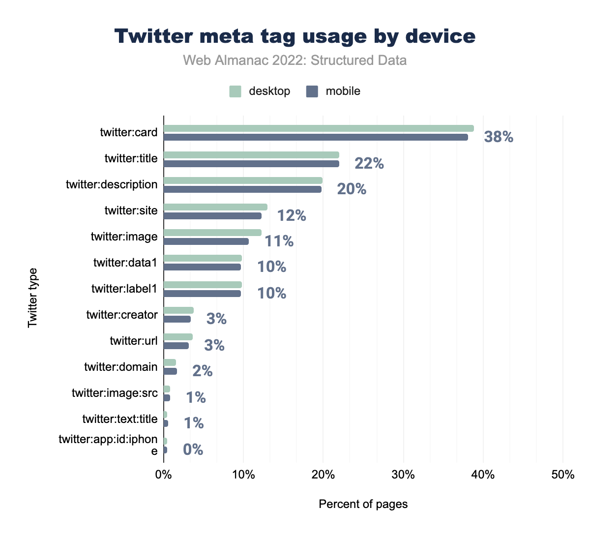 twitter:card è stato utilizzato nel 39% delle pagine desktop e nel 38% delle pagine mobili, twitter:title rispettivamente nel 22% e nel 22%, twitter:description nel 20% e nel 20%, twitter:image nel 12% e 12%, twitter:site nel 13% e 11%, twitter:label1 nel 10% e 10%, twitter:data1 nel 10% e 10%, twitter:creator nel 4% e 3%, twitter:url nel 4% e 3%, twitter:domain nel 2% e 2%, twitter:image:src nell’1% e 1%, twitter:text:title nello 0% e sull’1% e infine twitter:app:id:iphone è stato utilizzato nello 0% delle pagine desktop e mobili.I meta tag di Twitter come twitter:site e twitter:image hanno una presenza maggiore sui siti desktop, sebbene la maggior parte di questi meta tag condivida la stessa prevalenza tra dispositivi mobili e desktop, nonché di anno in anno. Alcuni dei tag meno comuni hanno visto un leggero calo nell’uso quest’anno, sebbene l’utilizzo dei meta tag di Twitter ottiene complessivamente un aumento rispetto allo scorso anno.