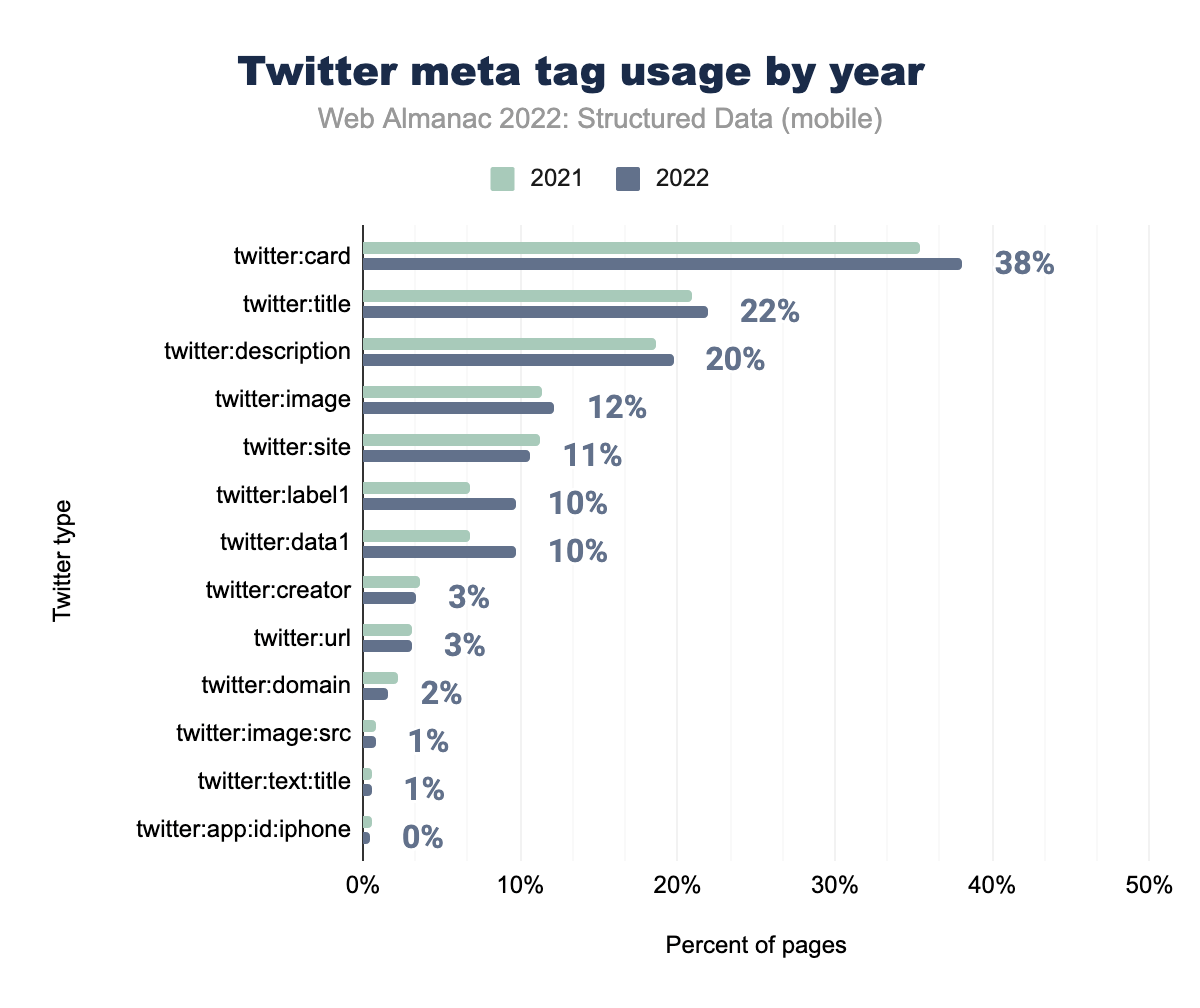 twitter:card è stato utilizzato nel 35% delle pagine mobili nel 2021 e nel 38% nel 2022, twitter:title rispettivamente nel 21% e nel 22%, twitter:description nel 19% e nel 20%, twitter:image nel 11% e 12%, twitter:site nel 11% e 11%, twitter:label1 nel 7% e 10%, twitter:data1 nel 7% e 10%, twitter: creator nel 4% e 3%, twitter:url nel 3% e 3%, twitter:domain nel 2% e 2%, twitter:image:src nell’1% e 1%, twitter: text:title nell’1% e nell’1% e infine twitter:app:id:iphone è stato utilizzato nell’1% delle pagine mobili nel 2021 e nello 0% nel 2022.I meta tag di Twitter seguono ancora una volta l’andamento di un aumento generale dell’utilizzo, più specificamente nei tag comuni di twitter:card, twitter:title, twitter:description e twitter:image. Un notevole aumento si apprezza per twitter:label1 e twitter:data1, entrambi dal 7% nel 2021 al 10% nel 2022 per le pagine mobili.